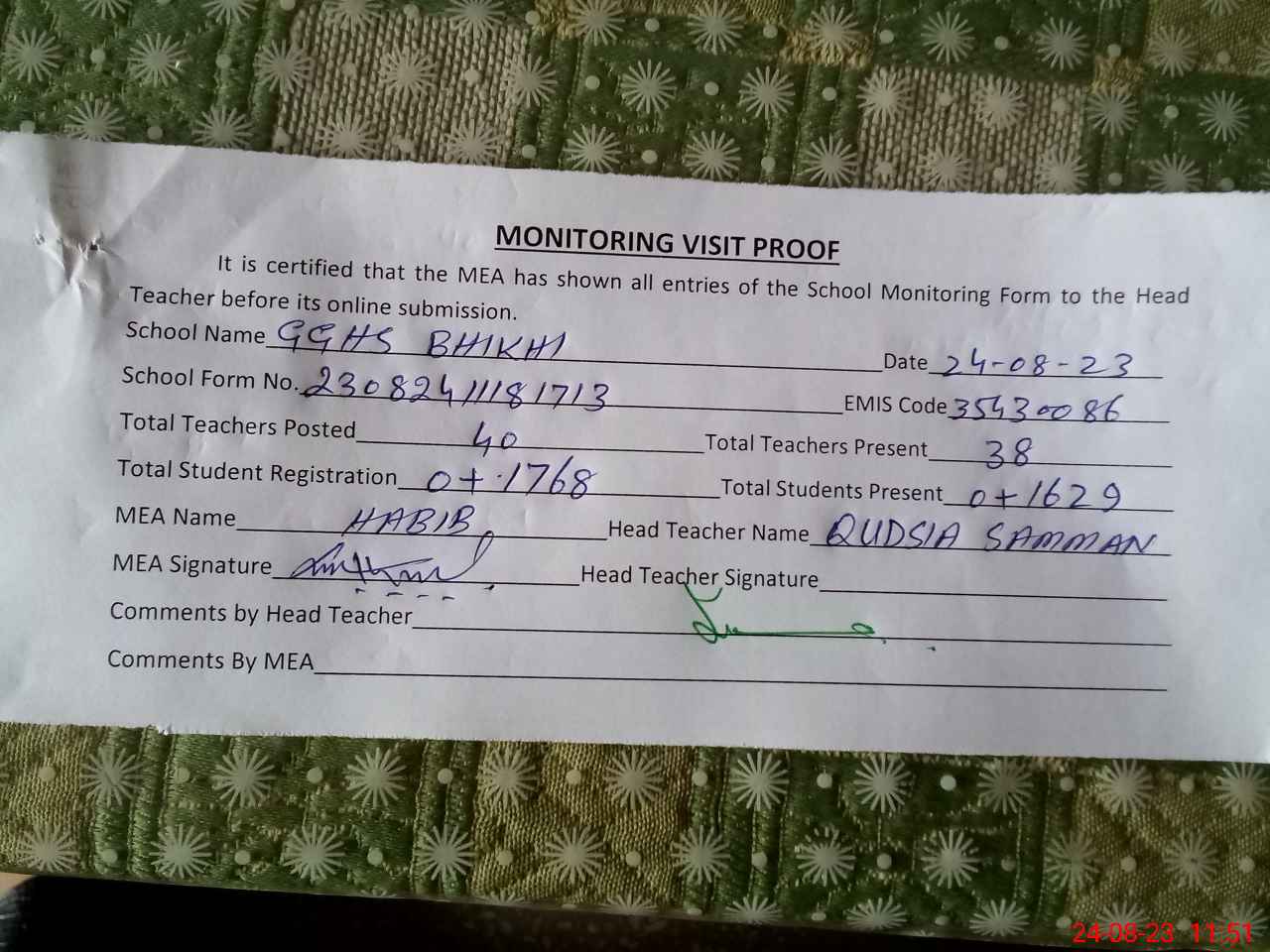 | Certified that this School was Inspected by the Undersigned MEA/DMO Today and the Information Stated Above is as Per Record. | |||||