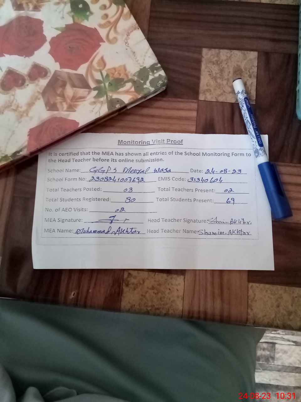 | Attendance Register | Head Teacher | MEA with School | Visit Proof |