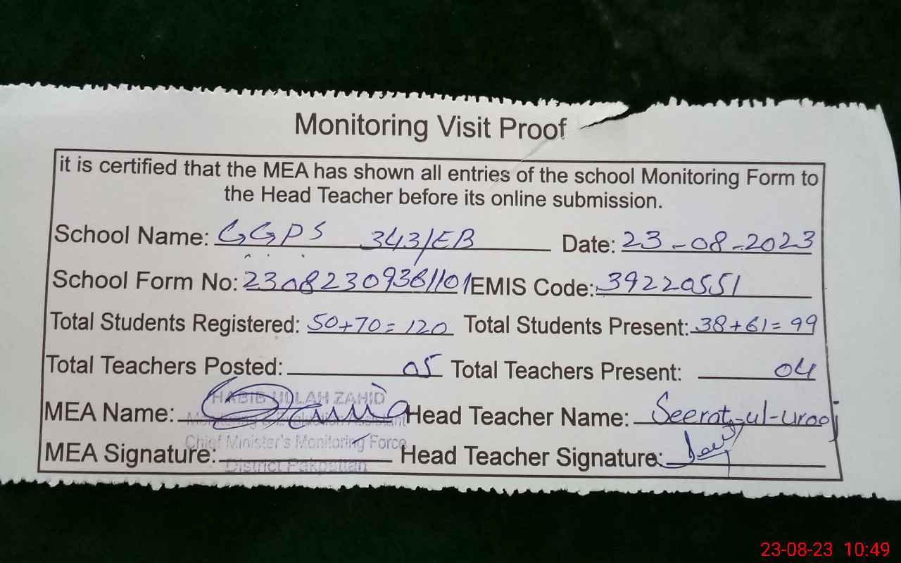 | Attendance Register | Head Teacher | MEA with School | Visit Proof |