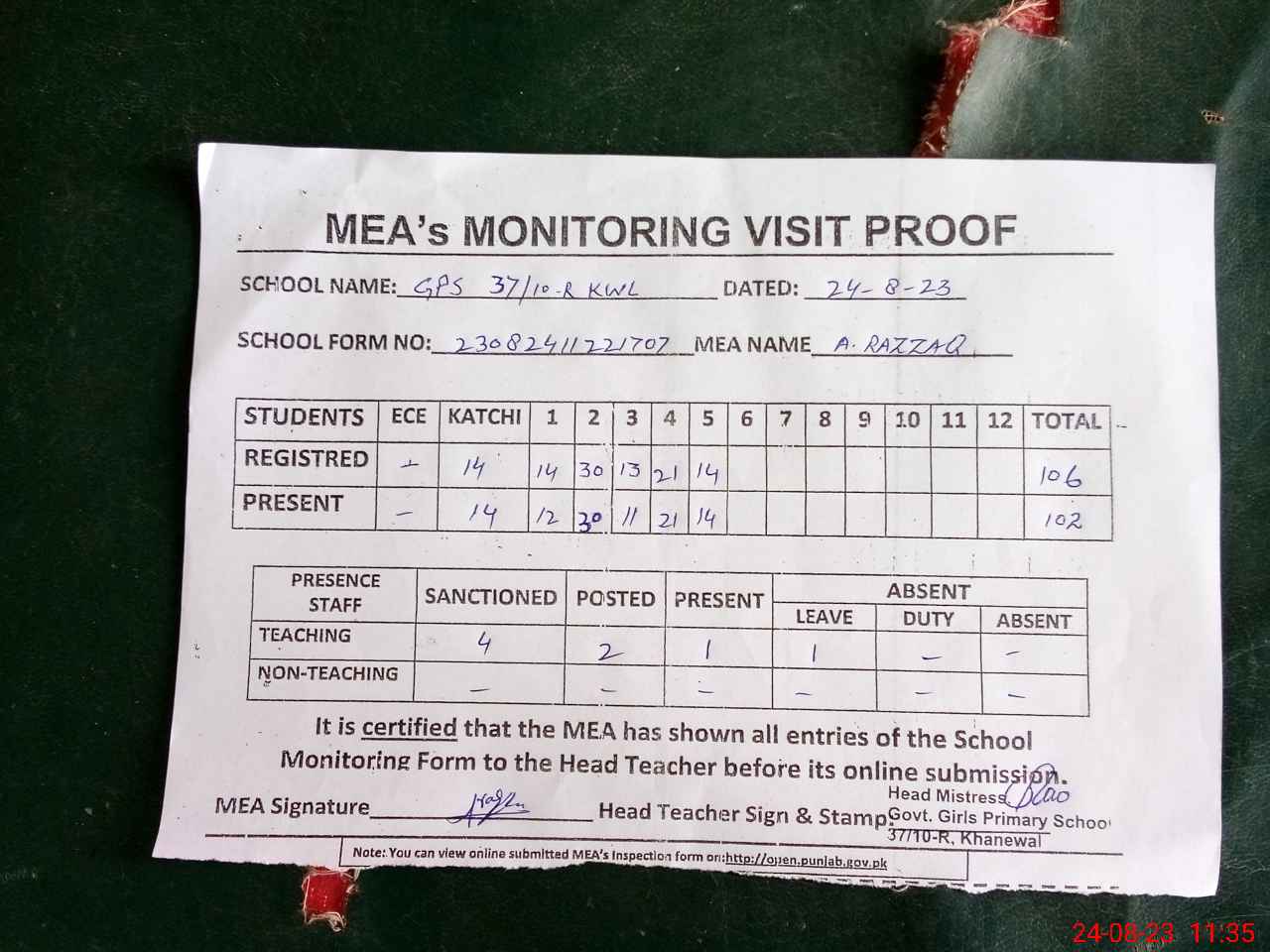 | Attendance Register | Head Teacher | MEA with School | Visit Proof |