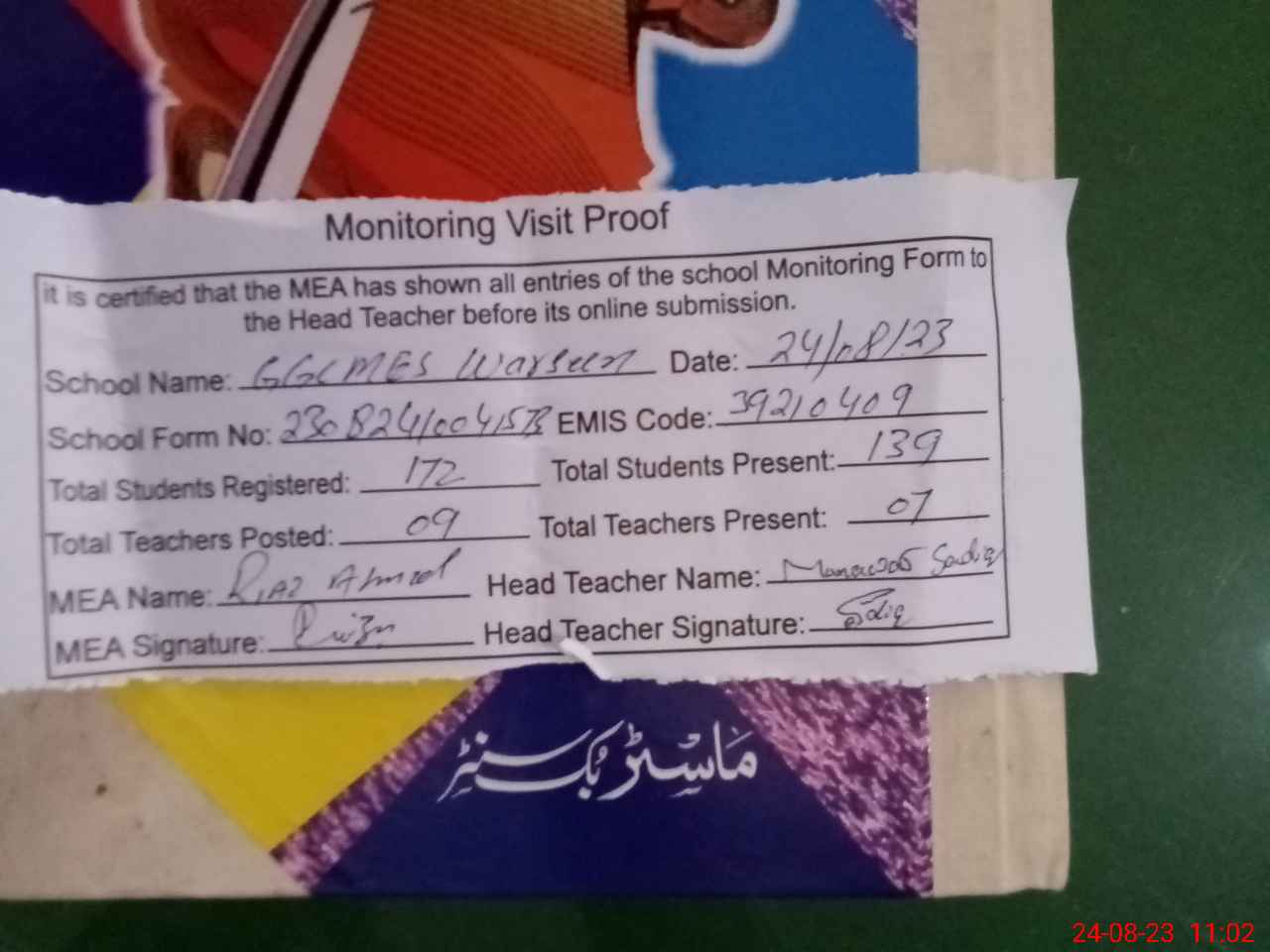 | Attendance Register | Head Teacher | MEA with School | Visit Proof |