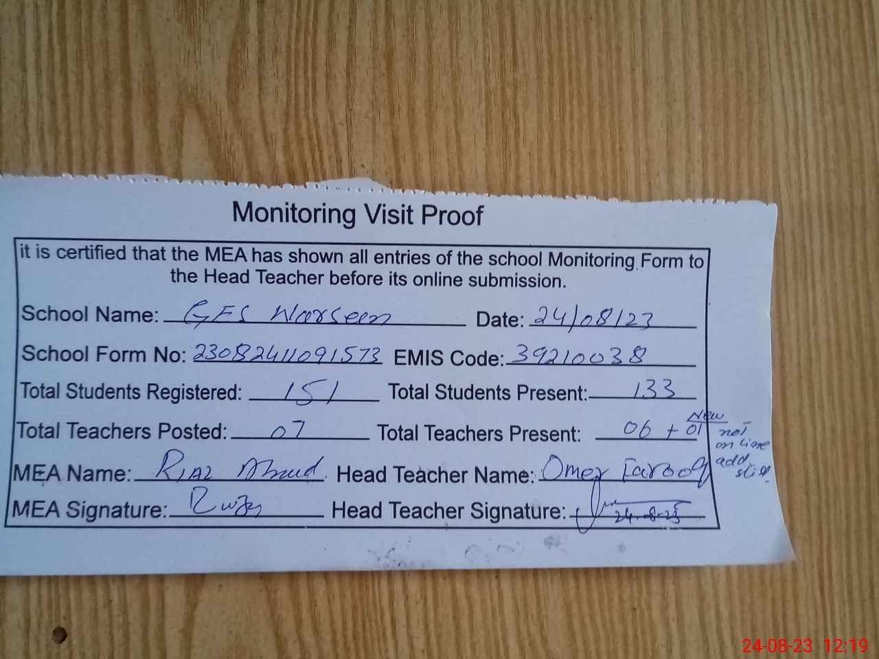 | Attendance Register | Head Teacher | MEA with School | Visit Proof |