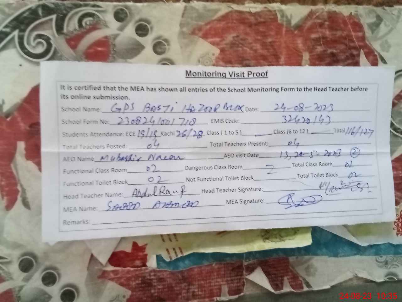 | Attendance Register | Head Teacher | MEA with School | Visit Proof |