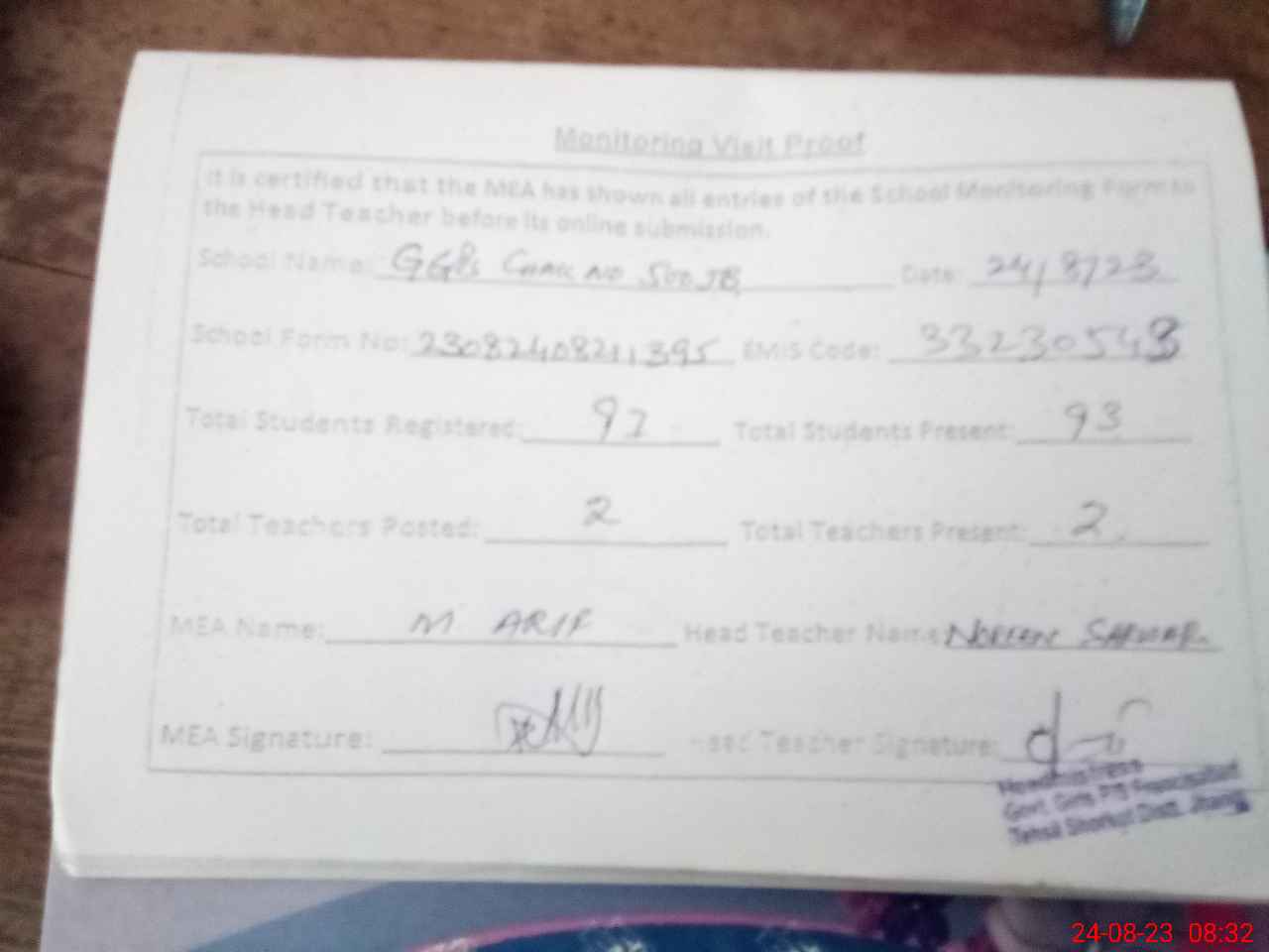 | Attendance Register | Head Teacher | MEA with School | Visit Proof |