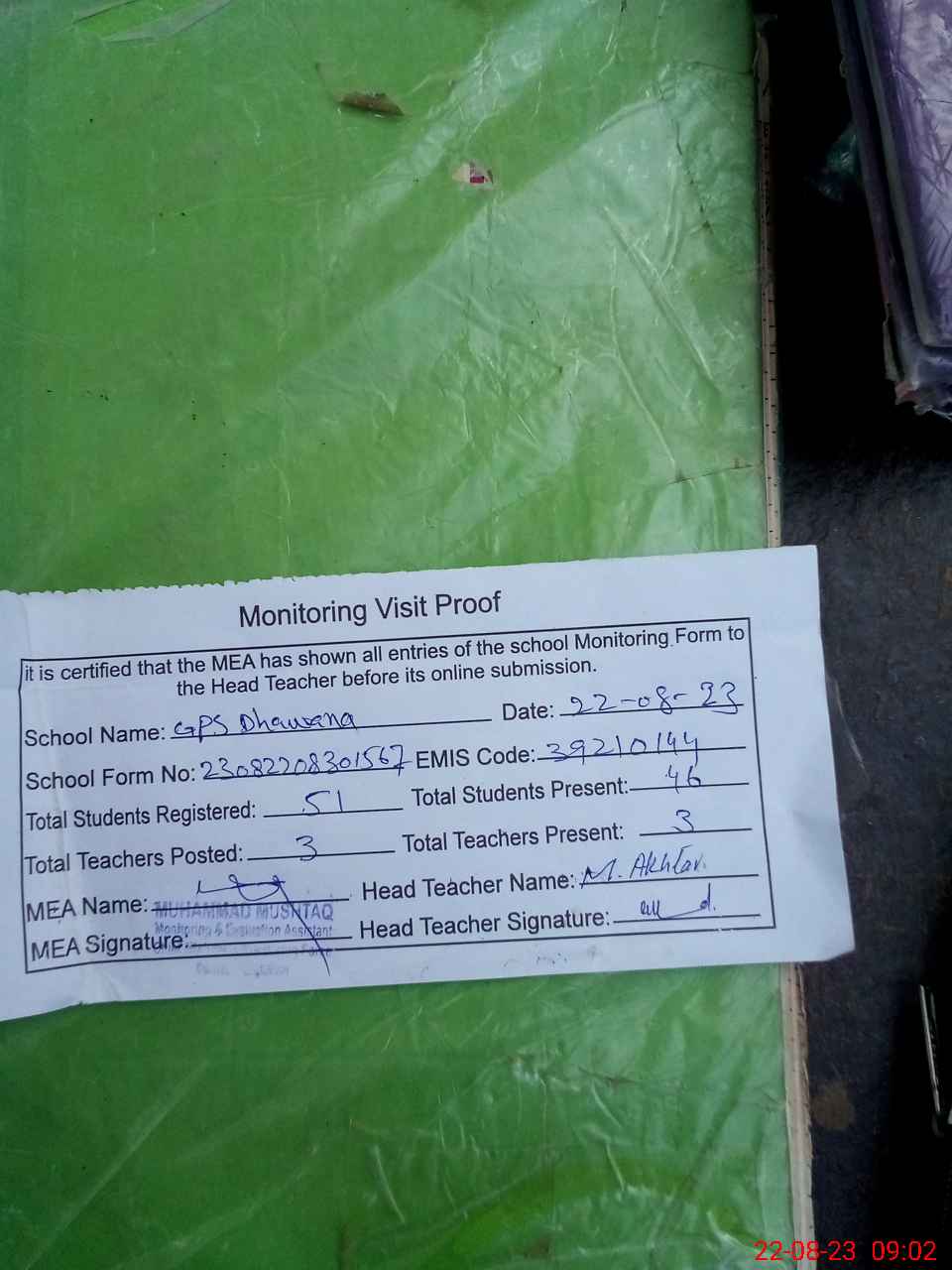 | Attendance Register | Head Teacher | MEA with School | Visit Proof |