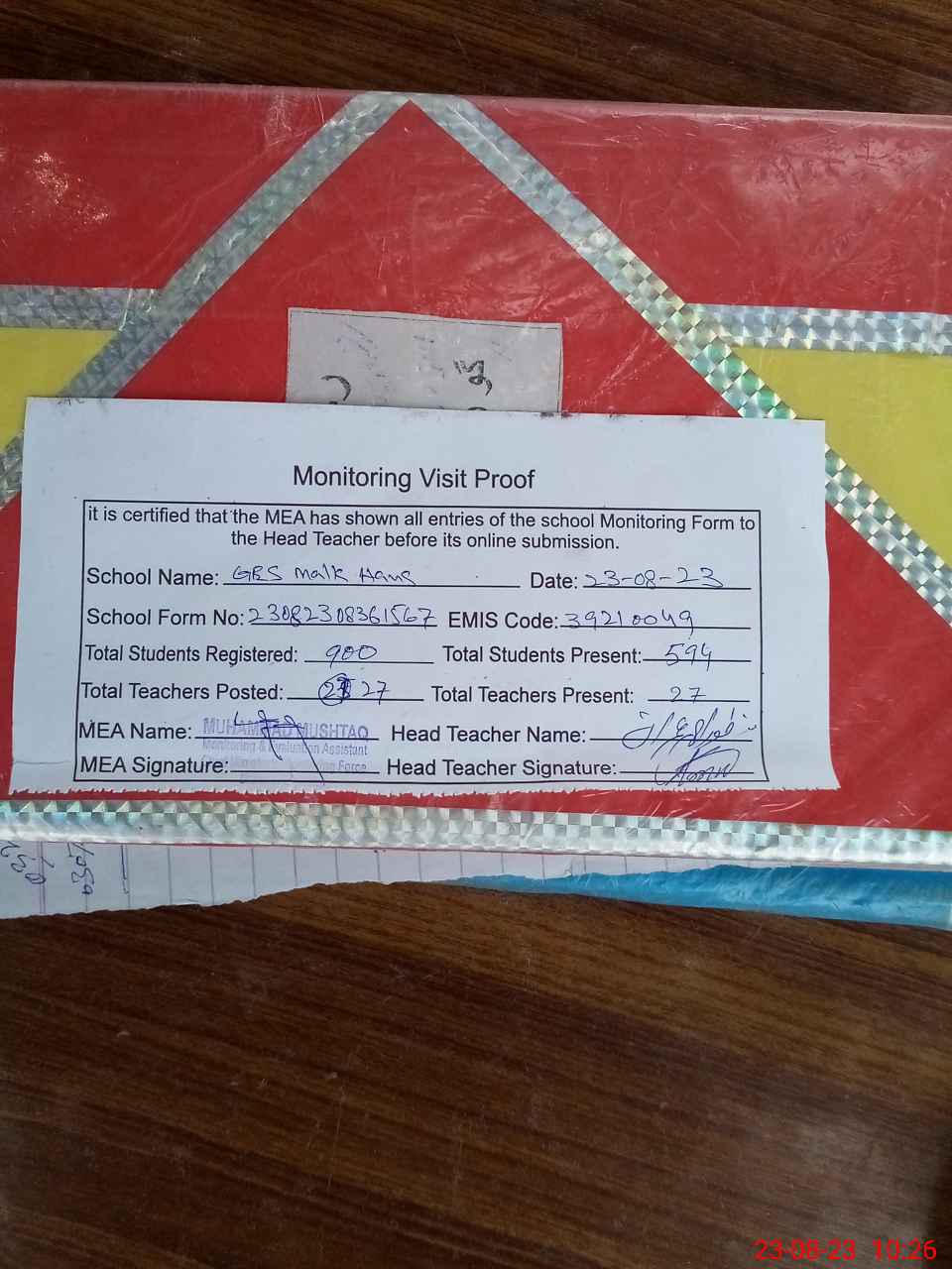 | Certified that this School was Inspected by the Undersigned MEA/DMO Today and the Information Stated Above is as Per Record. | |||||