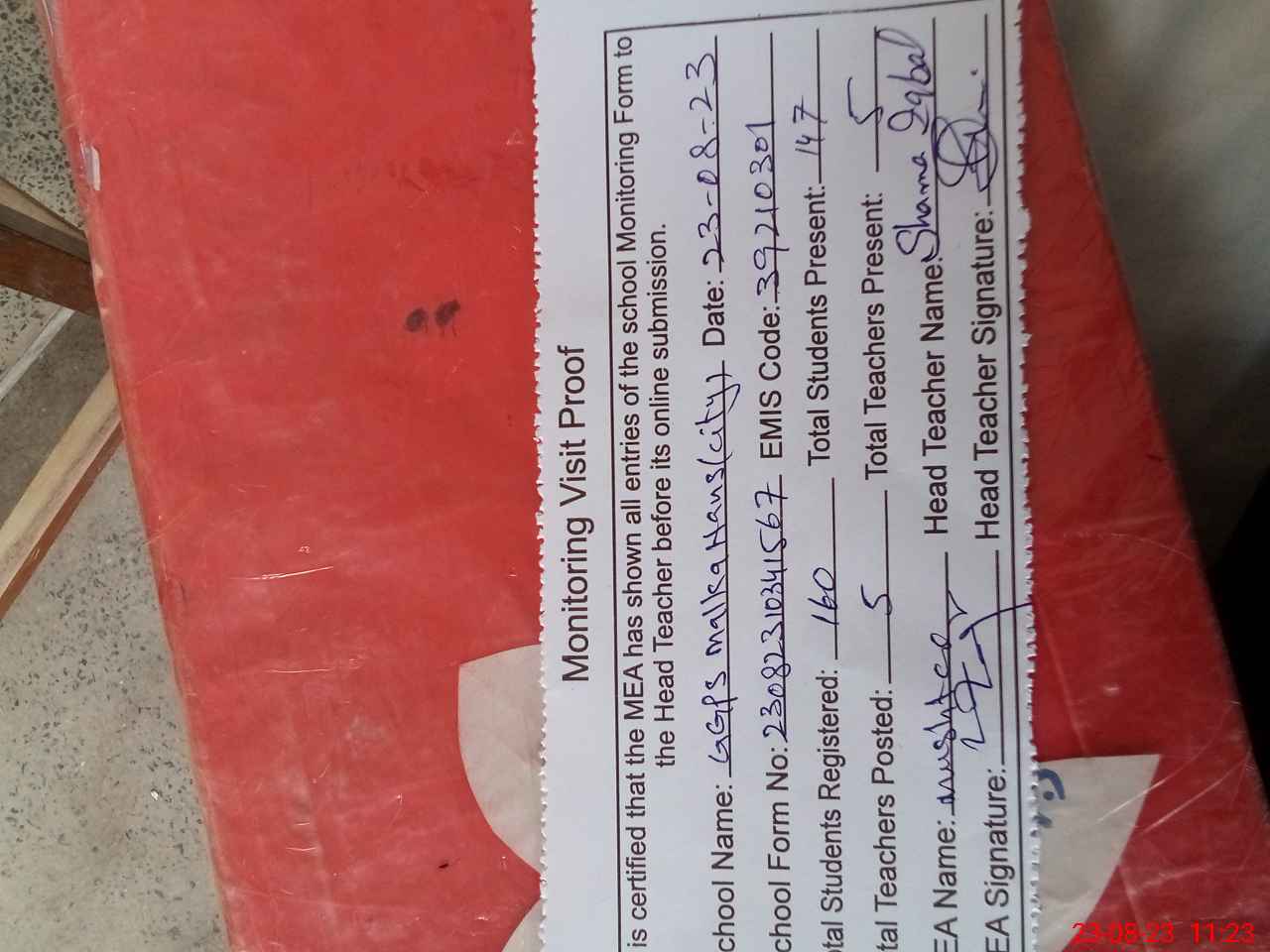 | Attendance Register | Head Teacher | MEA with School | Visit Proof |
