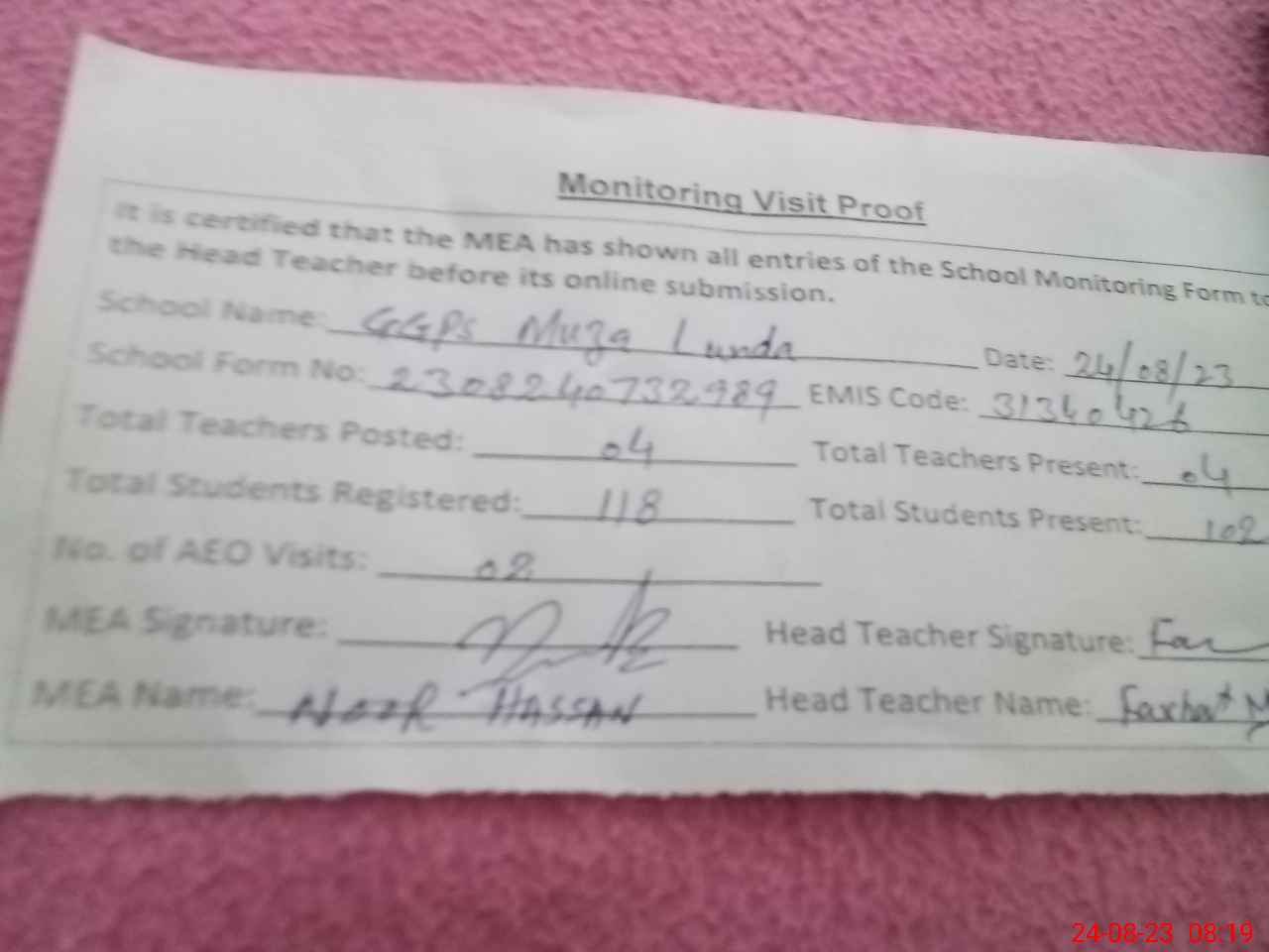 | Attendance Register | Head Teacher | MEA with School | Visit Proof |