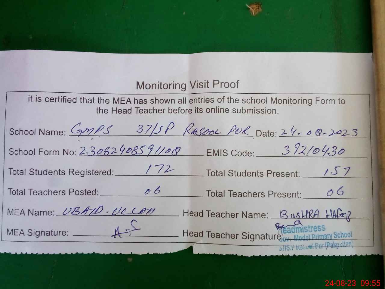 | Attendance Register | Head Teacher | MEA with School | Visit Proof |