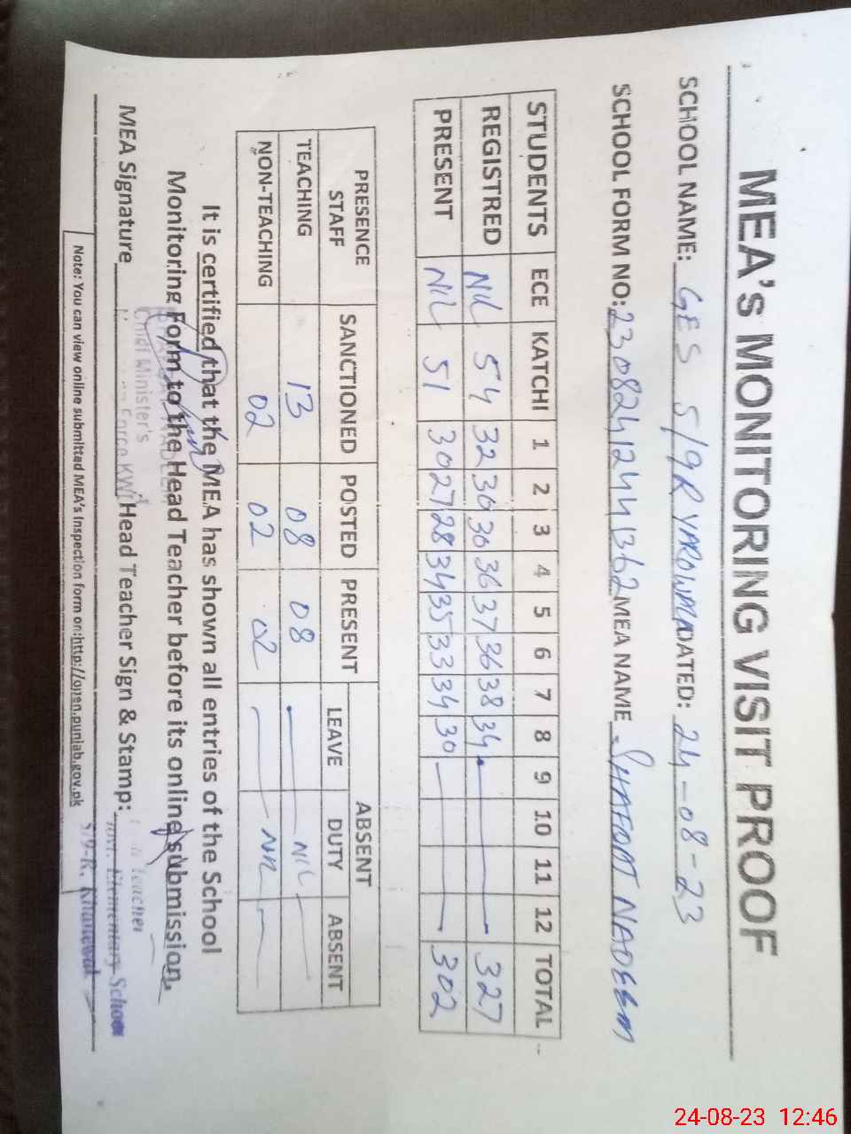| Attendance Register | Head Teacher | MEA with School | Visit Proof |