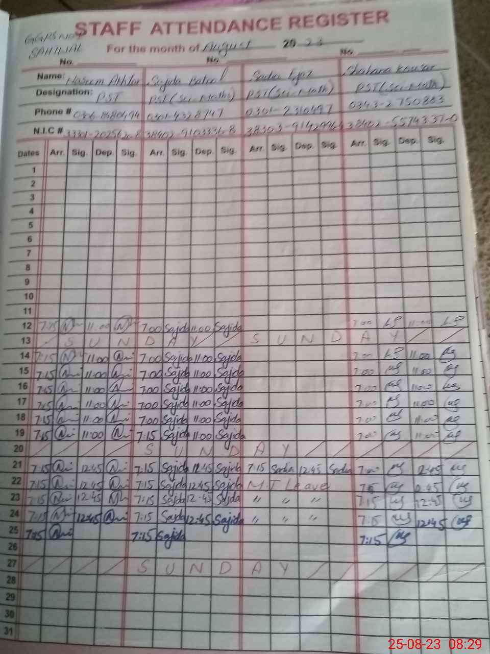 | CNIC | Full Name | Designation | R/C | Absence during last cal. month |
