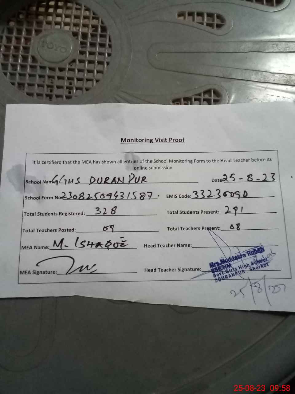| Attendance Register | Head Teacher | MEA with School | Visit Proof |