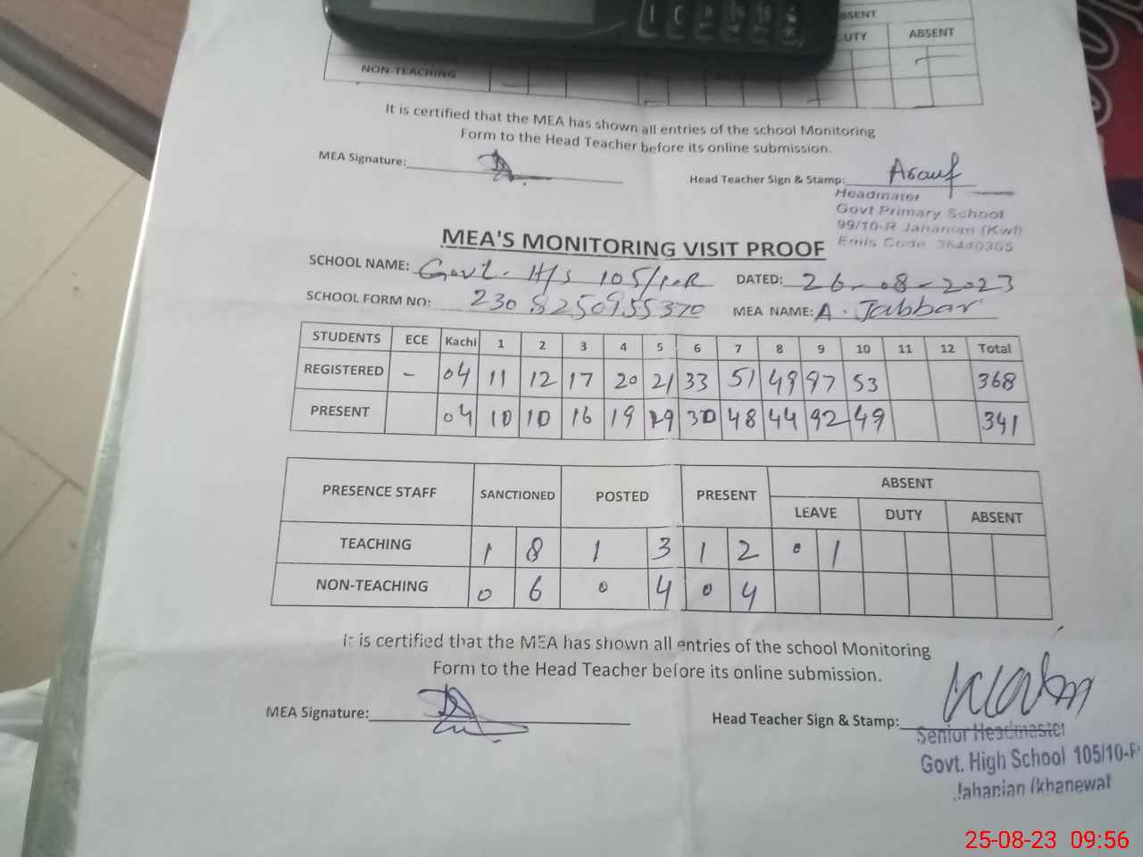| Attendance Register | Head Teacher | MEA with School | Visit Proof |