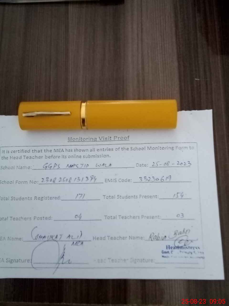 | Attendance Register | Head Teacher | MEA with School | Visit Proof |