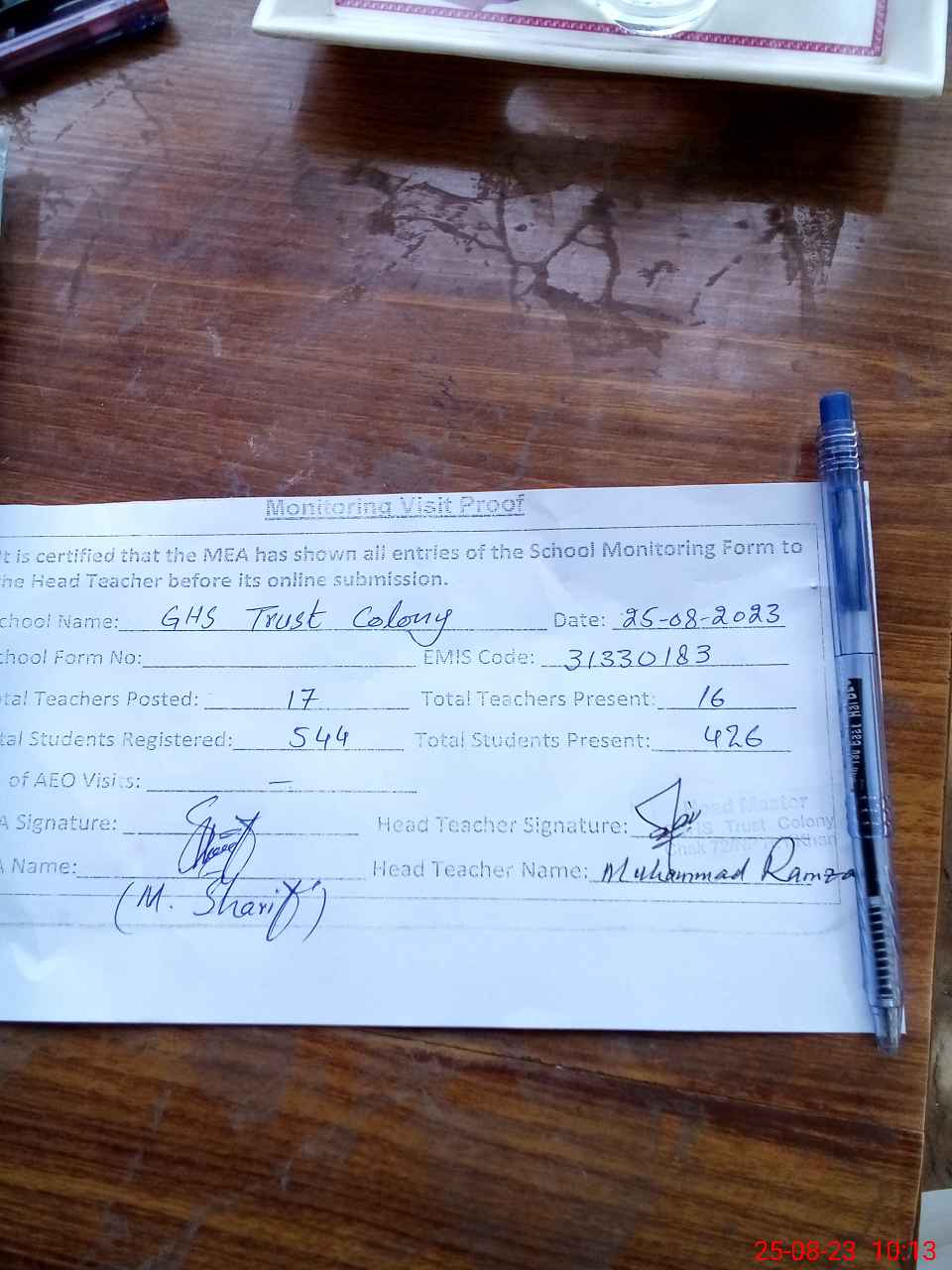 | Monitoring Date: 25-08-2023 | Start Time: 25-08-2023 09:20 AM | End Time: 25-08-2023 10:30 AM | Name of MEA: Mu**** Sh**** | |