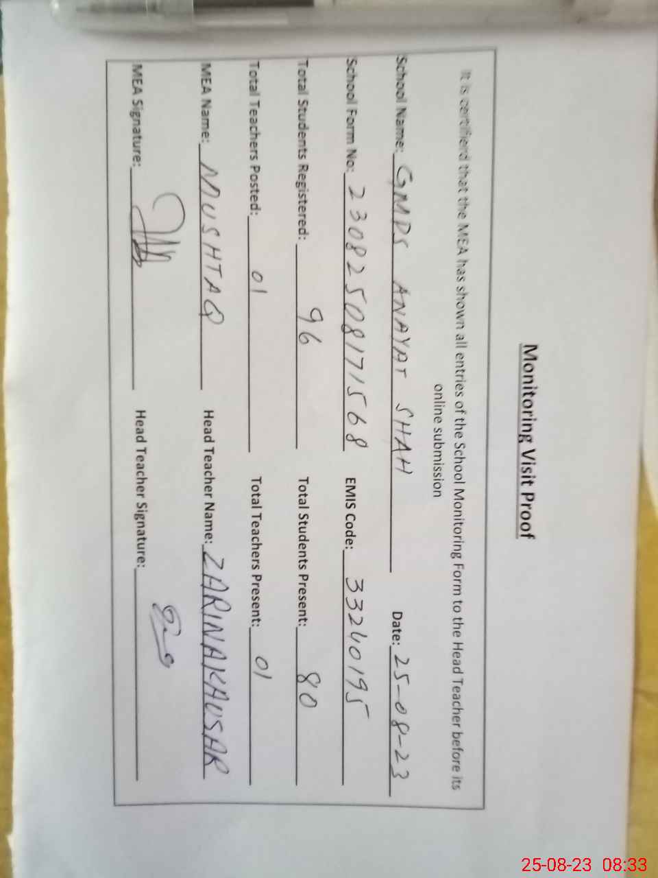 | Attendance Register | Head Teacher | MEA with School | Visit Proof |
