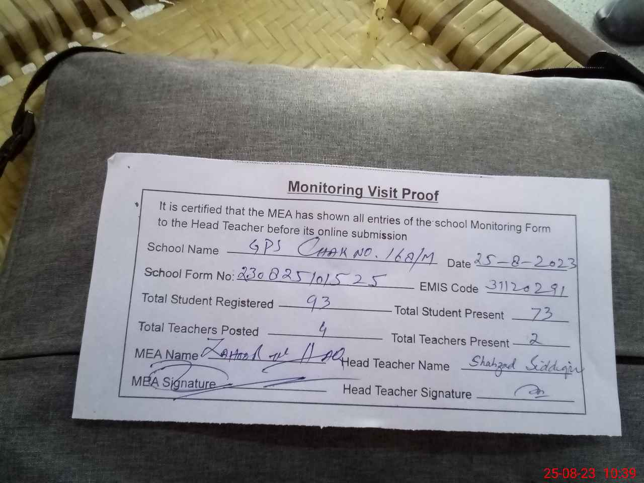 | Attendance Register | Head Teacher | MEA with School | Visit Proof |