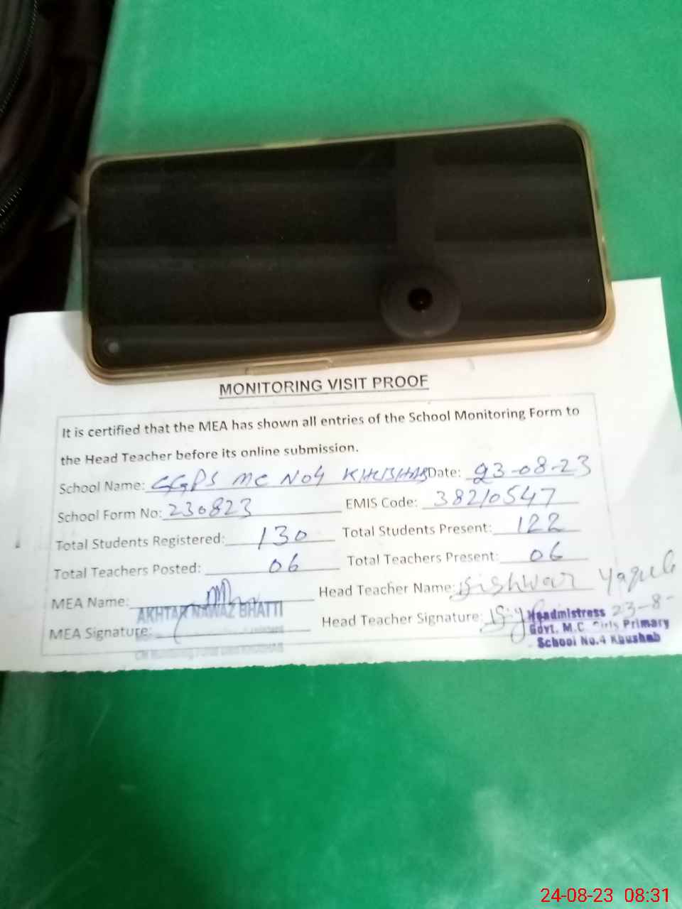 | Attendance Register | Head Teacher | MEA with School | Visit Proof |