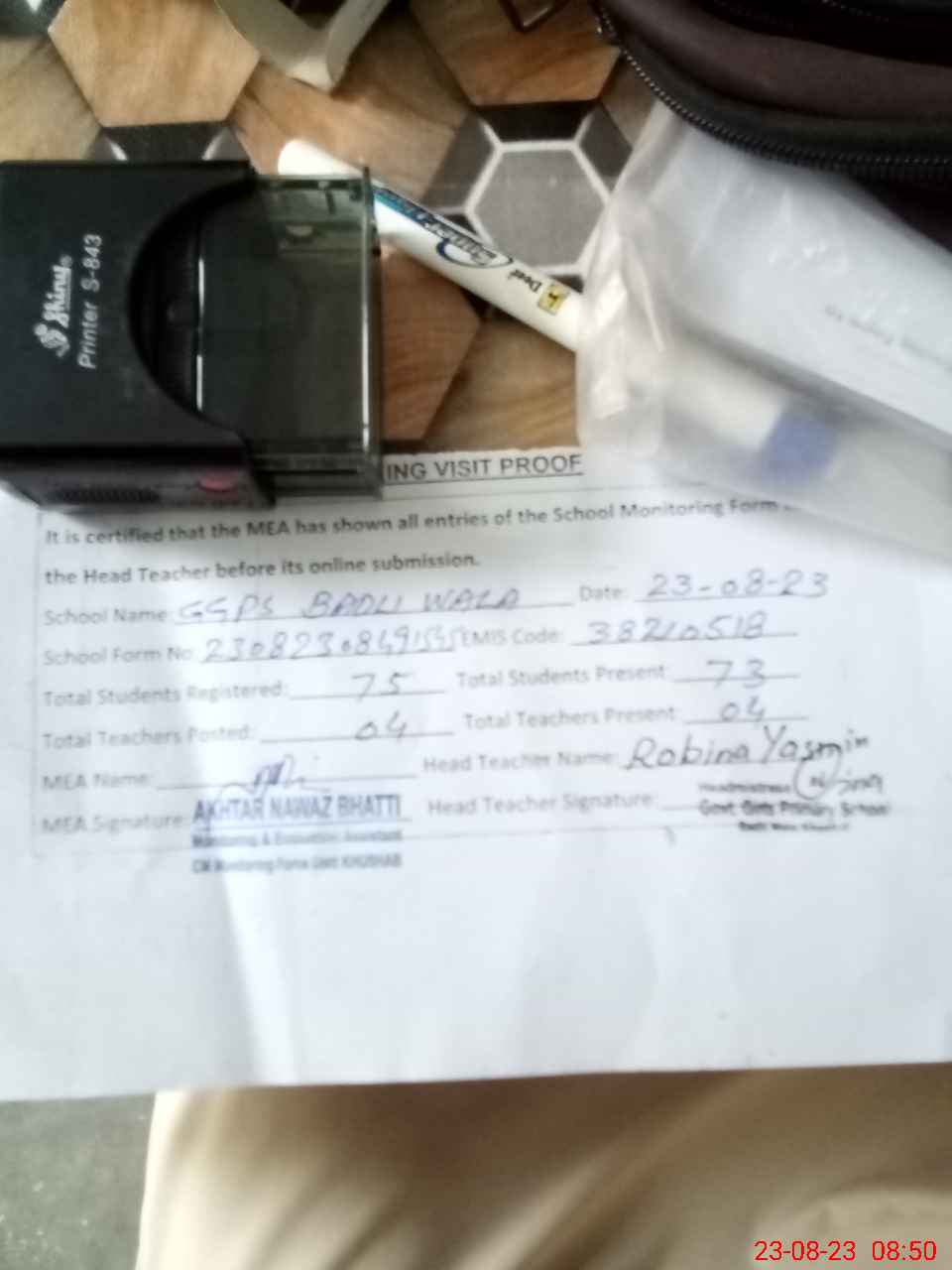 | Attendance Register | Head Teacher | MEA with School | Visit Proof |