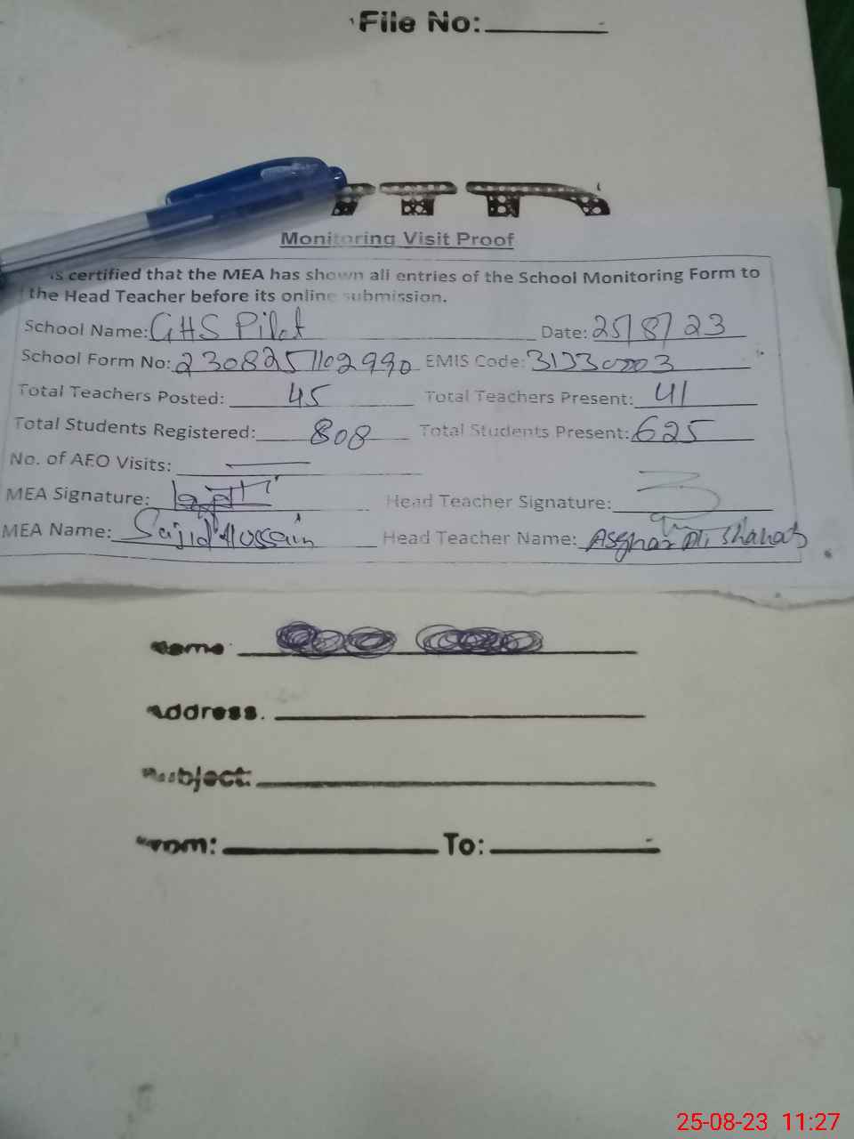 | Attendance Register | Head Teacher | MEA with School | Visit Proof |