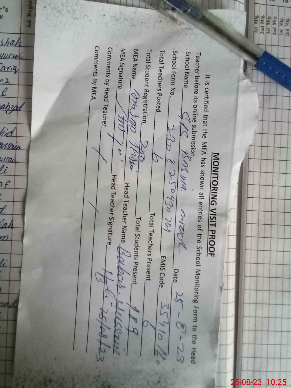| Attendance Register | Head Teacher | MEA with School | Visit Proof |
