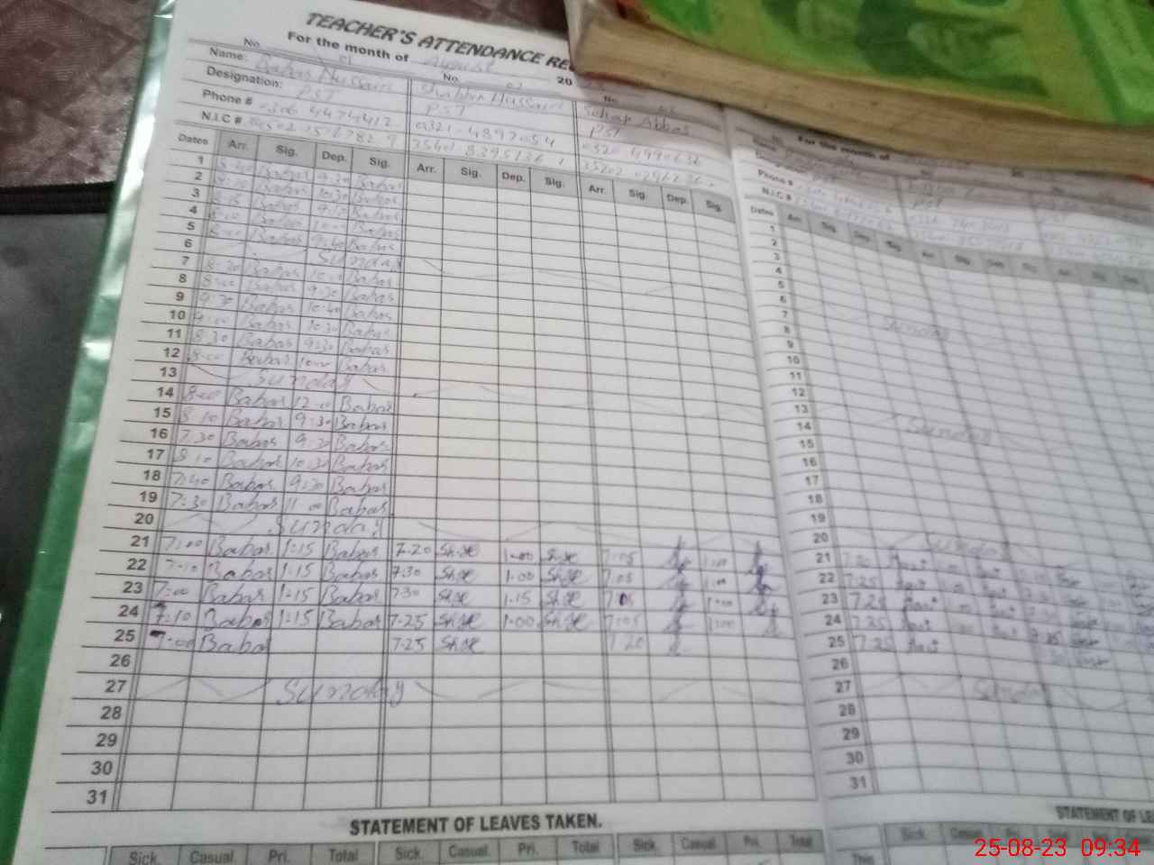 | CNIC | Full Name | Designation | R/C | Absence During Last Calender Month |