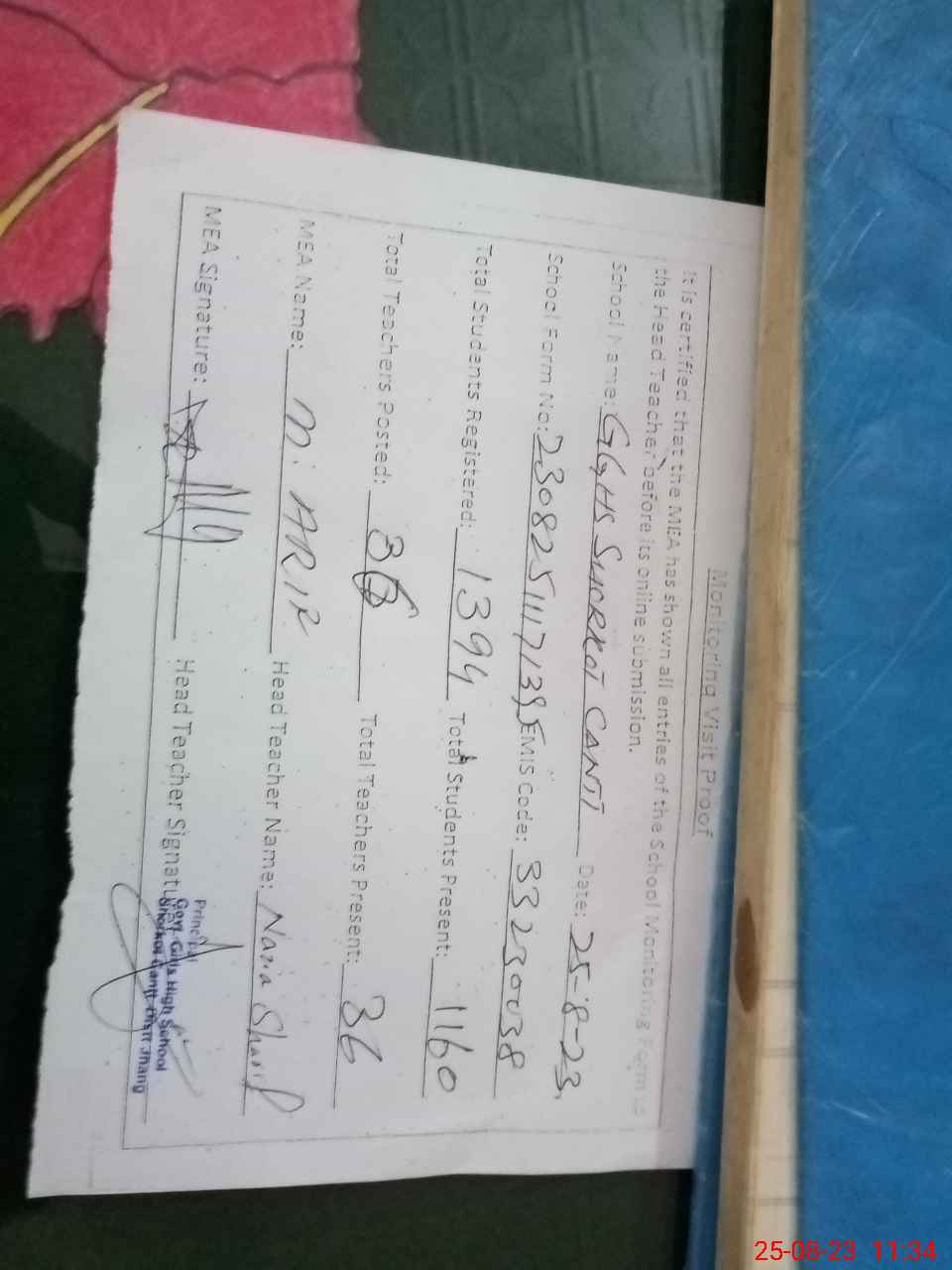 | Certified that this School was Inspected by the Undersigned MEA/DMO Today and the Information Stated Above is as Per Record. | |||||