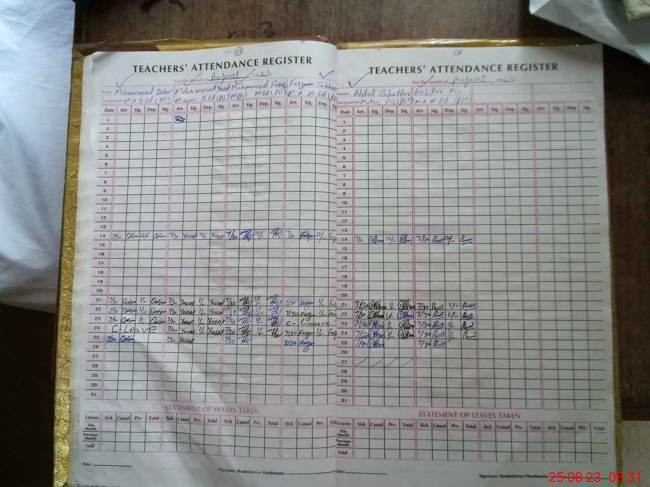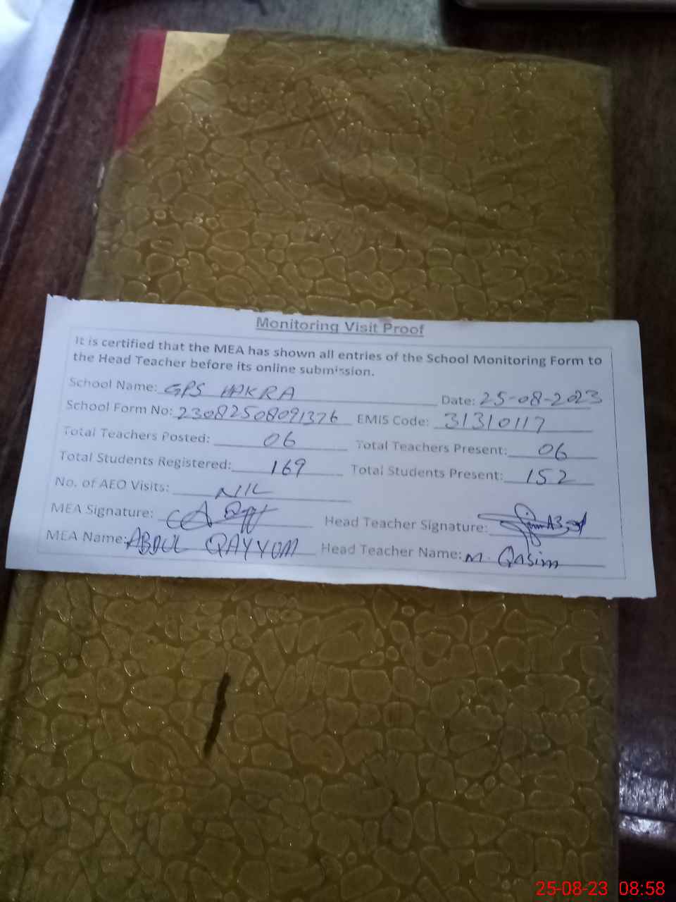 | Attendance Register | Head Teacher | MEA with School | Visit Proof |