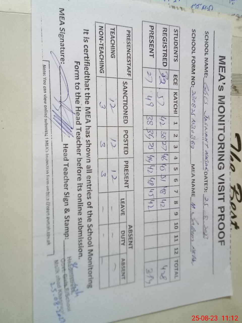 | Attendance Register | Head Teacher | MEA with School | Visit Proof |