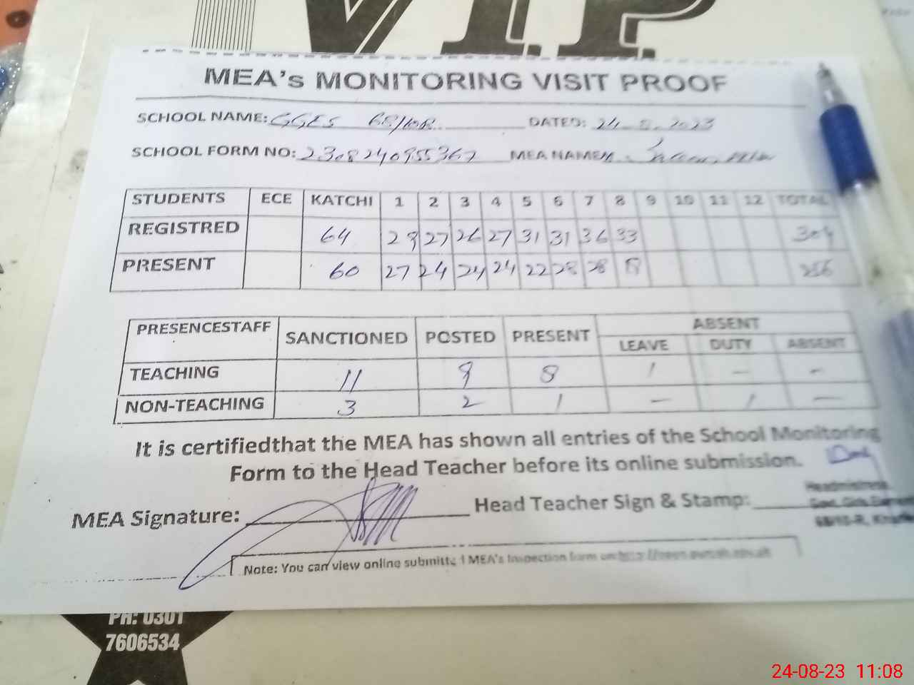 | Attendance Register | Head Teacher | MEA with School | Visit Proof |