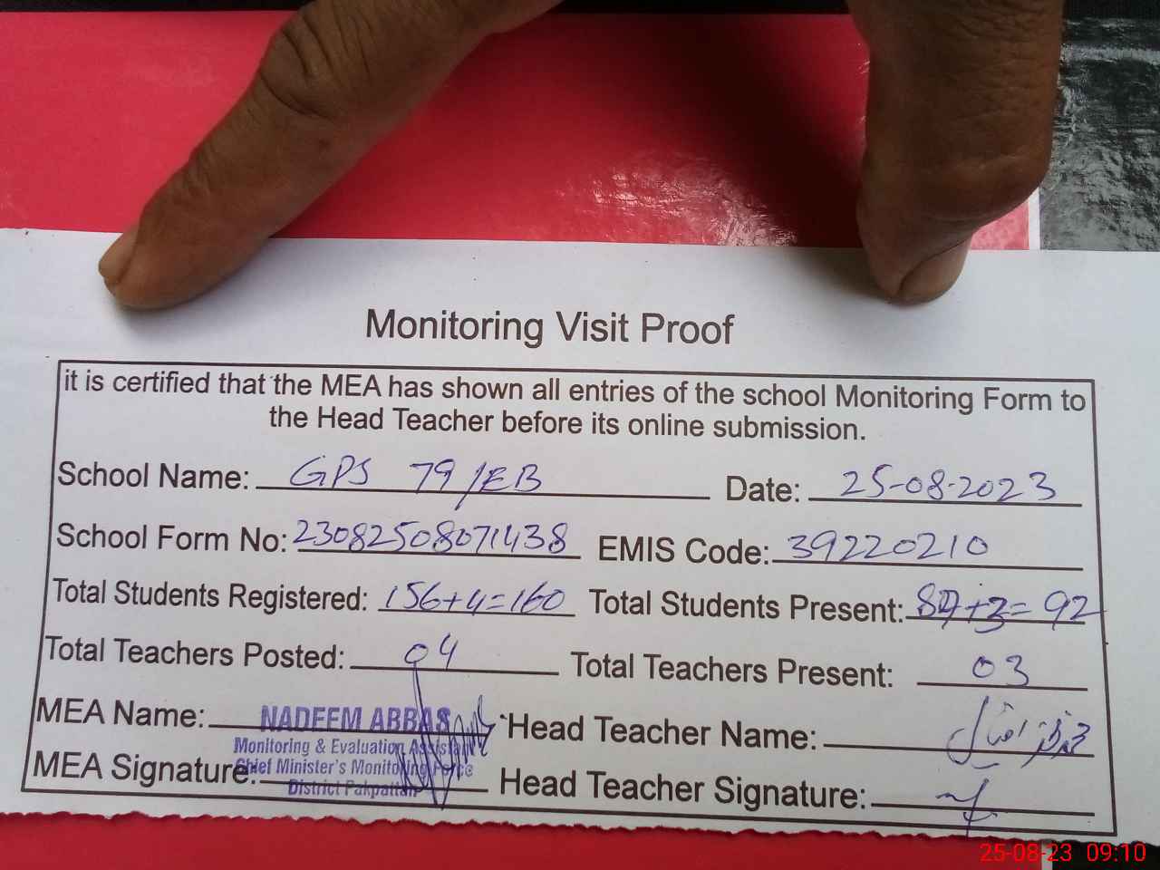| Attendance Register | Head Teacher | MEA with School | Visit Proof |