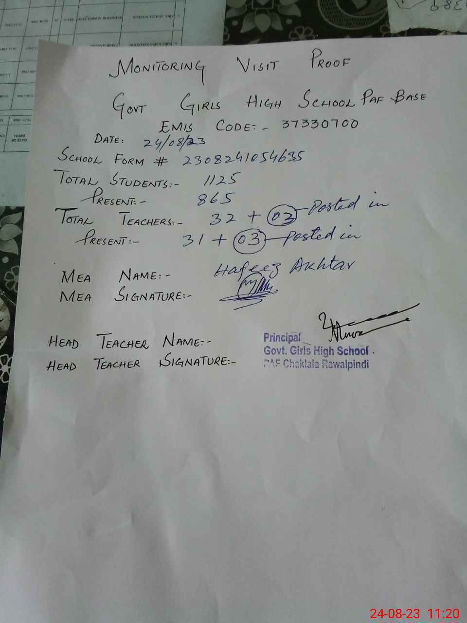 | Attendance Register | Head Teacher | MEA with School | Visit Proof |