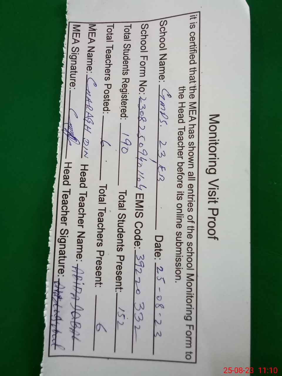 | Attendance Register | Head Teacher | MEA with School | Visit Proof |