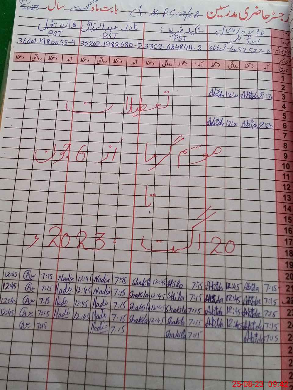 | CNIC | Full Name | Designation | R/C | Absence During Last Calender Month |