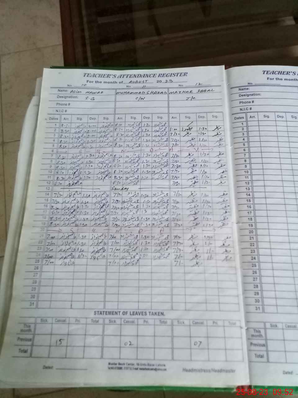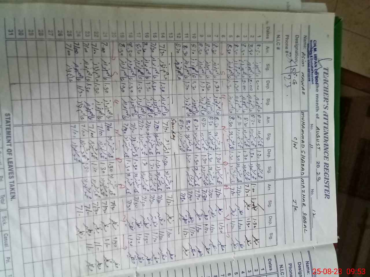 | CNIC | Full Name | Designation | R/C | Absence During Last Calender Month |