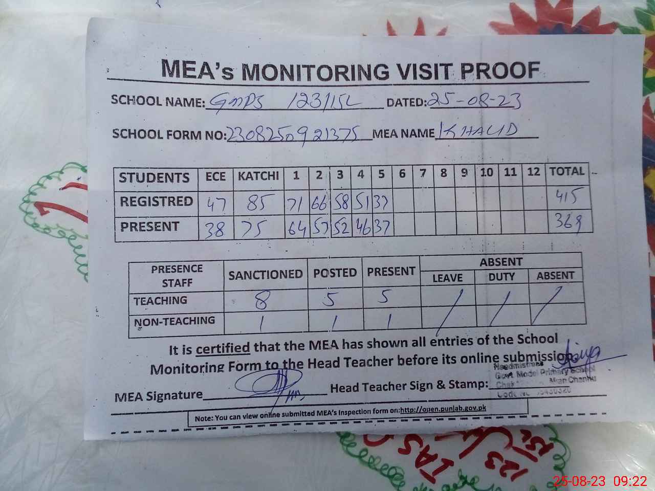 | Attendance Register | Head Teacher | MEA with School | Visit Proof |