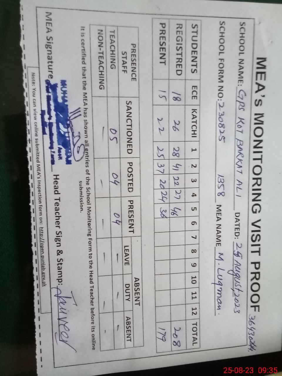 | EMIS Code: 36430244 | Name of School: GPS KOT BARKAT ALI, TULAMBA | |||