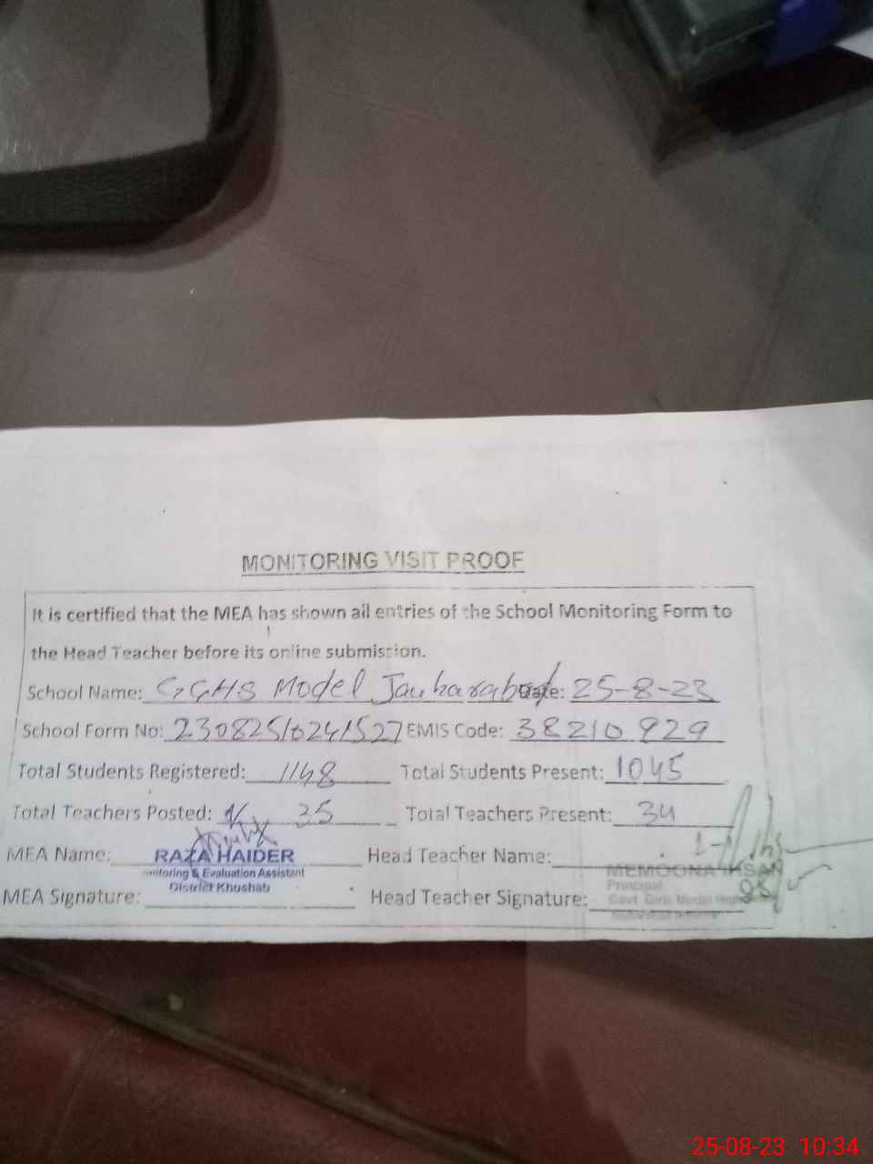 | Attendance Register | Head Teacher | MEA with School | Visit Proof |
