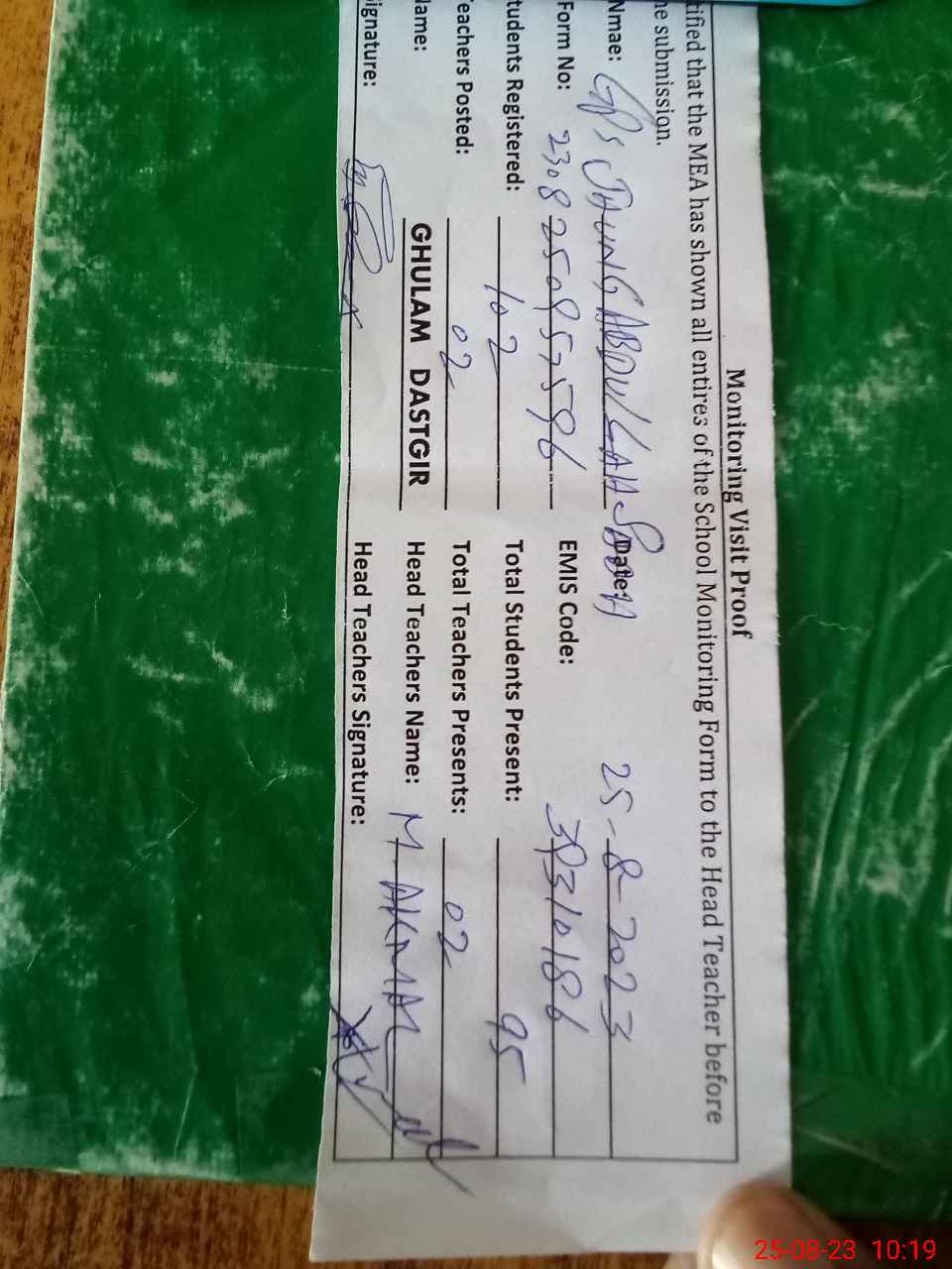 | Attendance Register | Head Teacher | MEA with School | Visit Proof |
