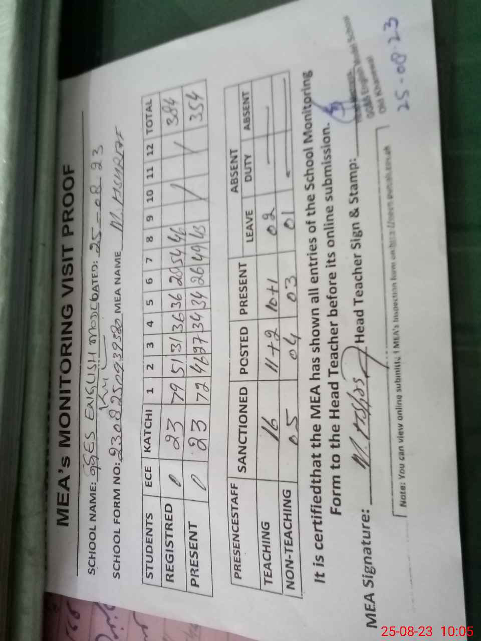| Attendance Register | Head Teacher | MEA with School | Visit Proof |