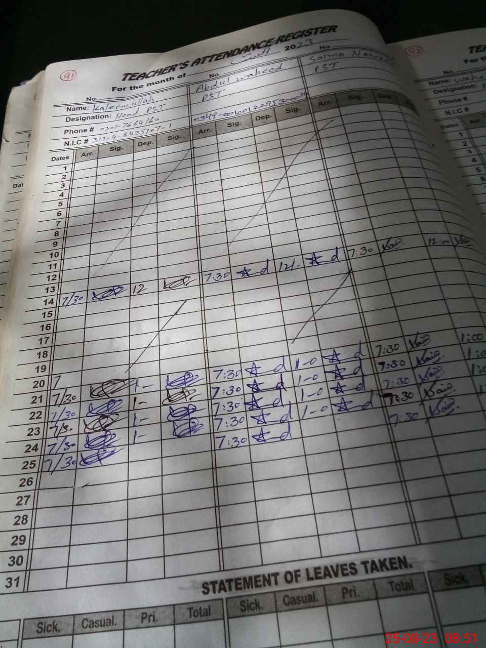 | CNIC | Full Name | Designation | R/C | Absence During Last Calender Month |