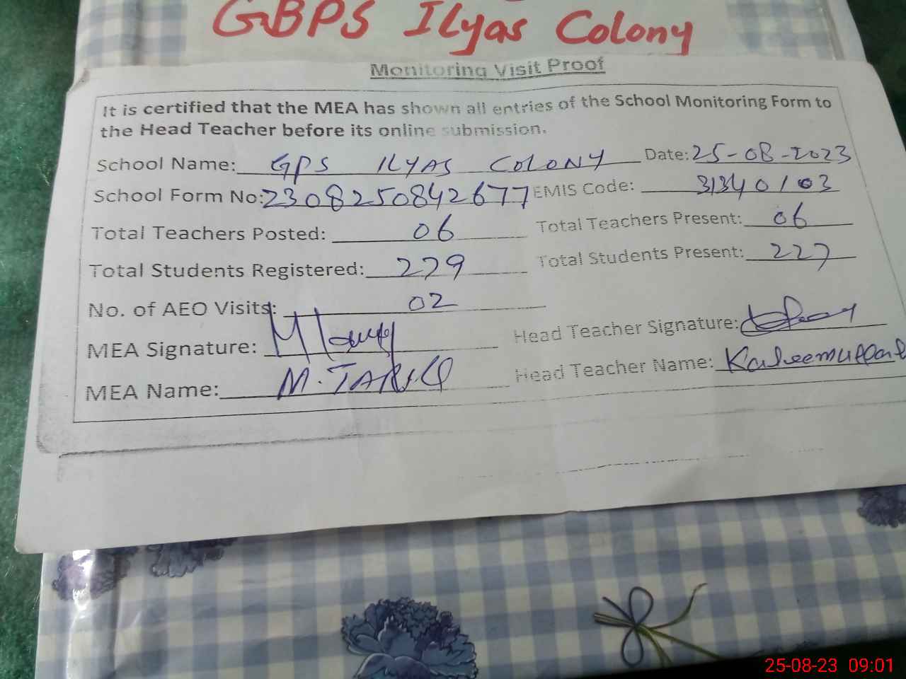 | Attendance Register | Head Teacher | MEA with School | Visit Proof |