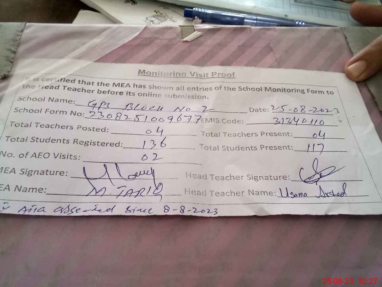 | Attendance Register | Head Teacher | MEA with School | Visit Proof |