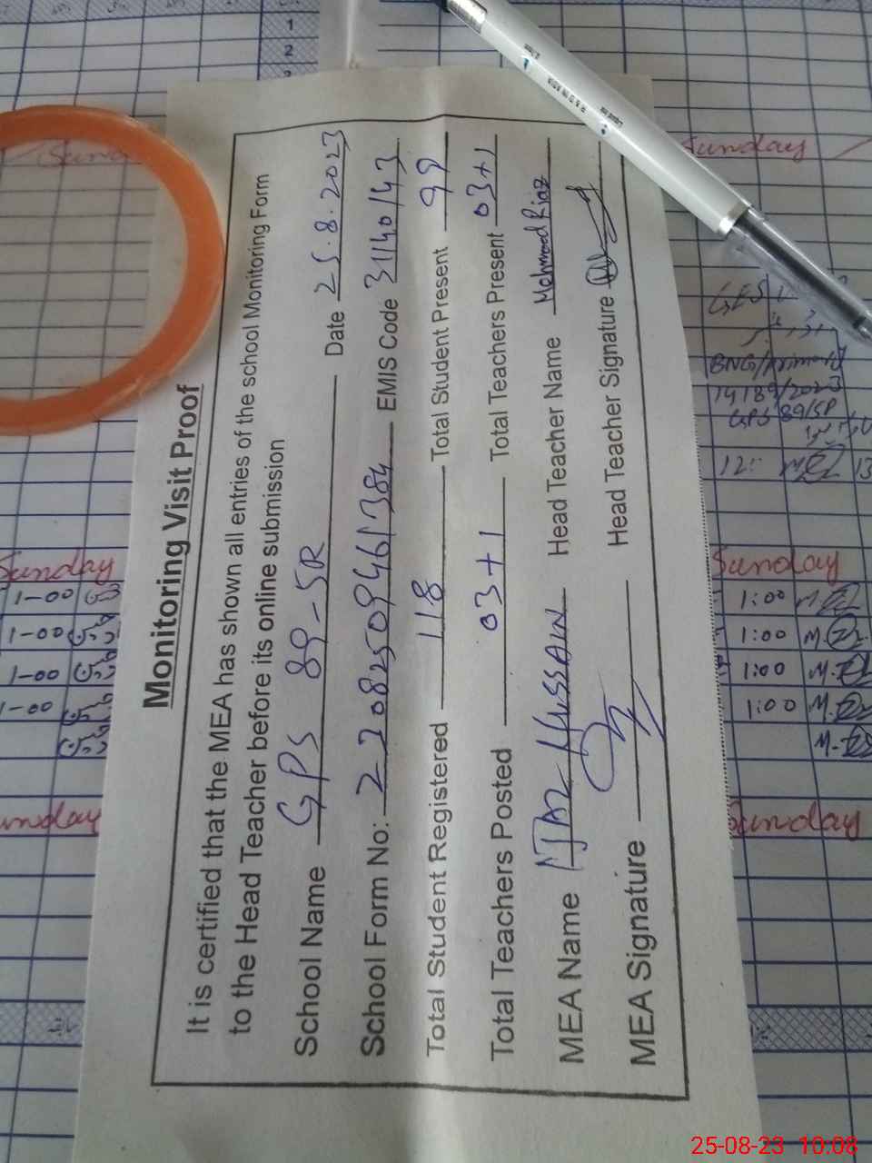 | Attendance Register | Head Teacher | MEA with School | Visit Proof |
