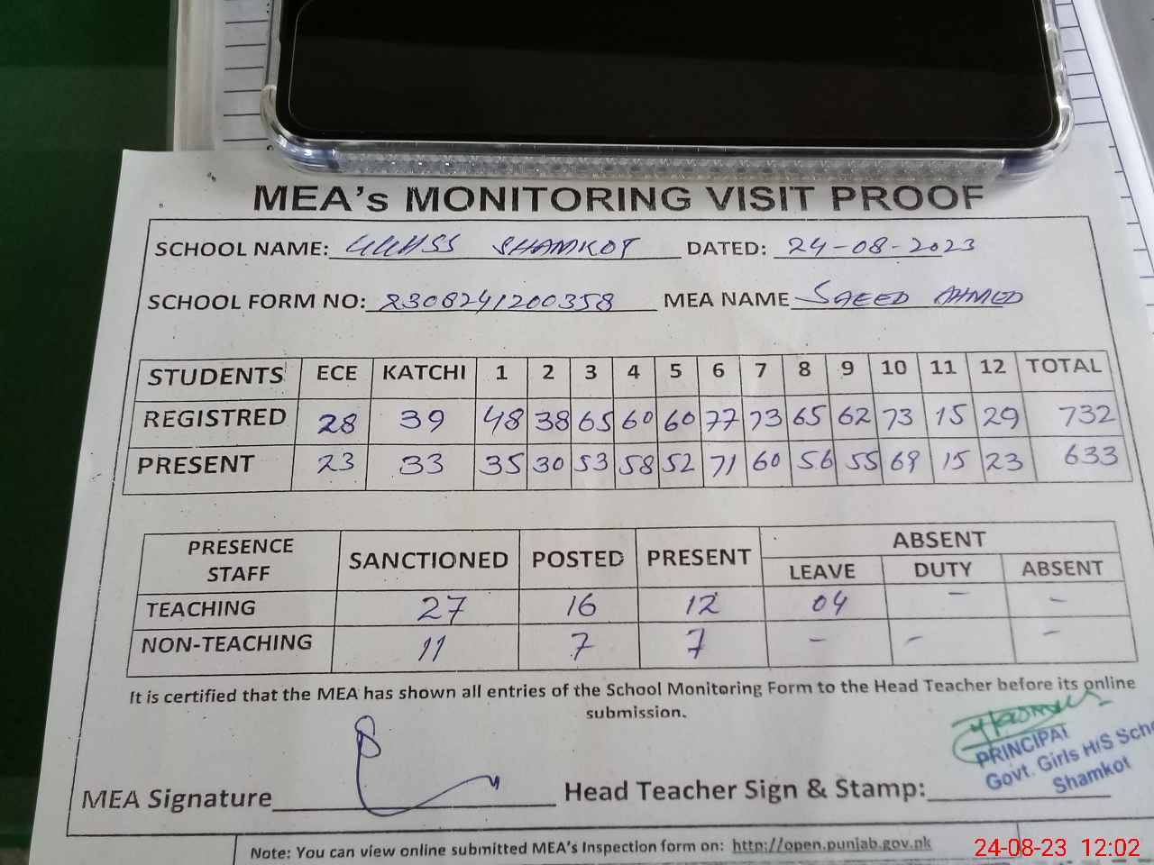 | Attendance Register | Head Teacher | MEA with School | Visit Proof |