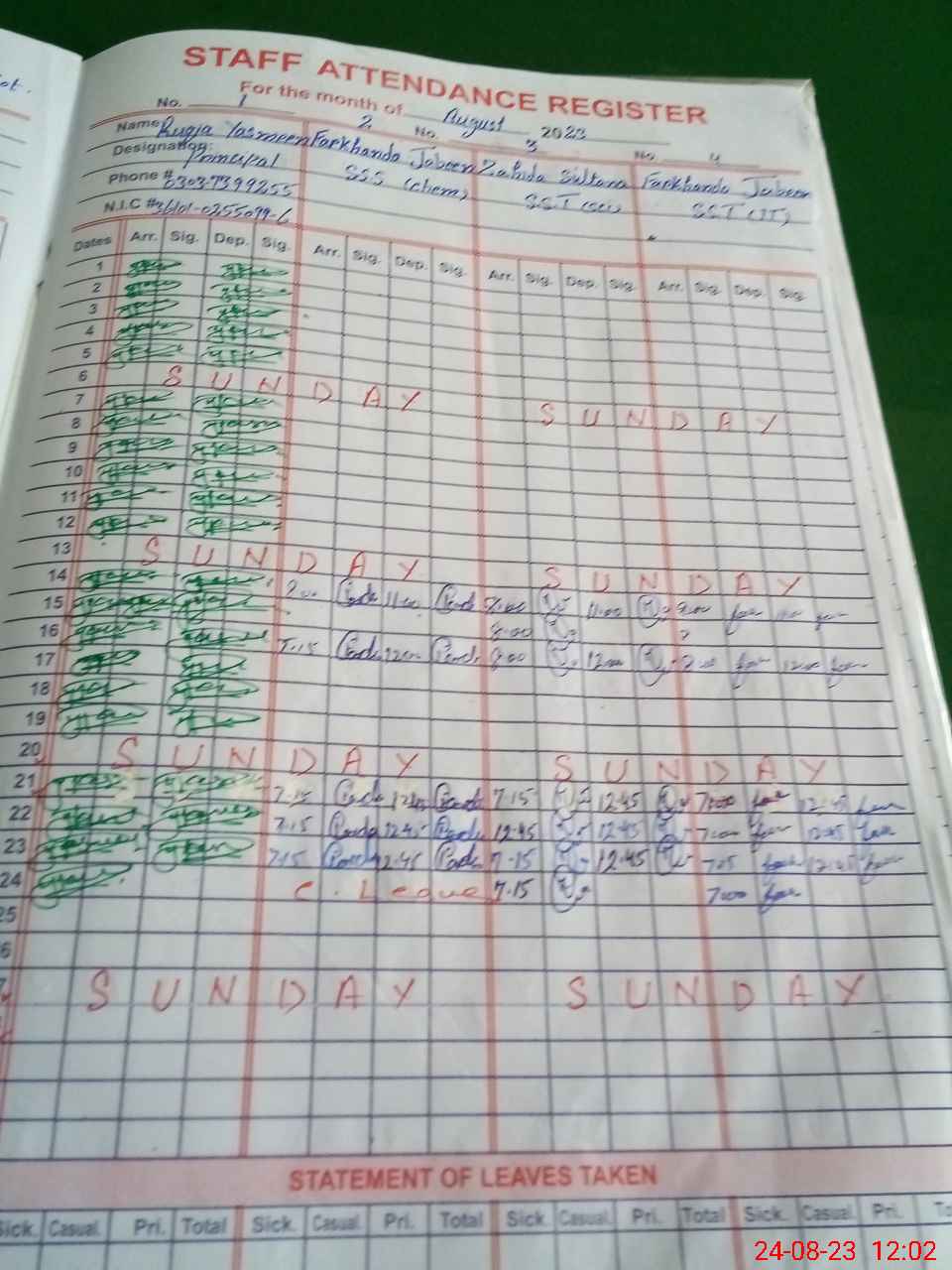 | CNIC | Full Name | Designation | R/C | Absence During Last Calender Month |