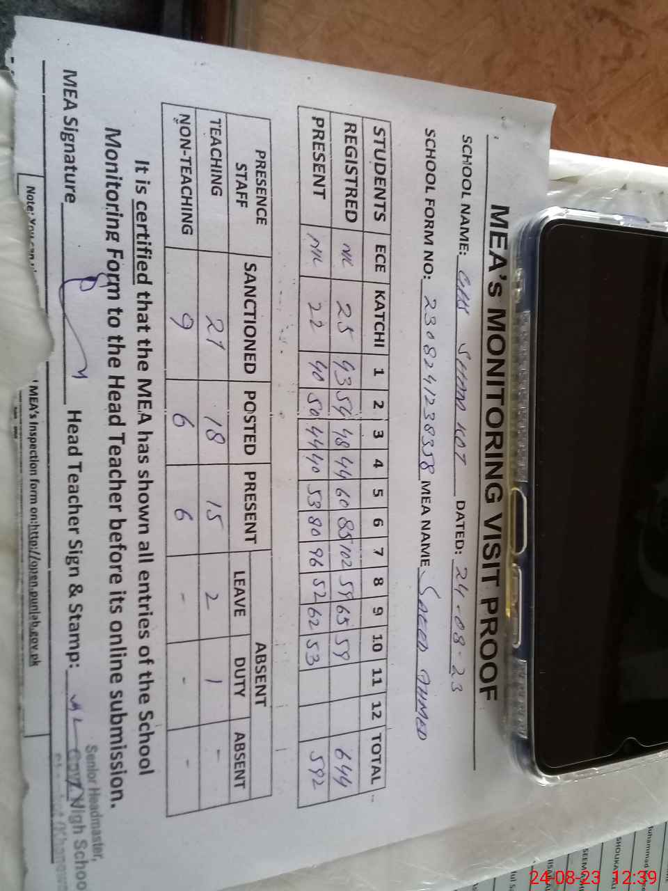 | Attendance Register | Head Teacher | MEA with School | Visit Proof |