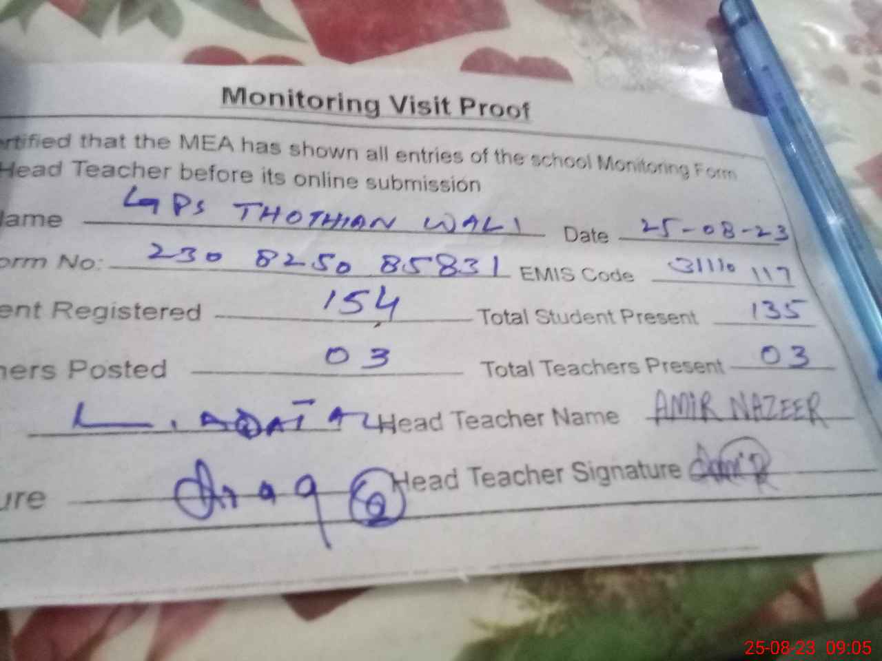 | Attendance Register | Head Teacher | MEA with School | Visit Proof |