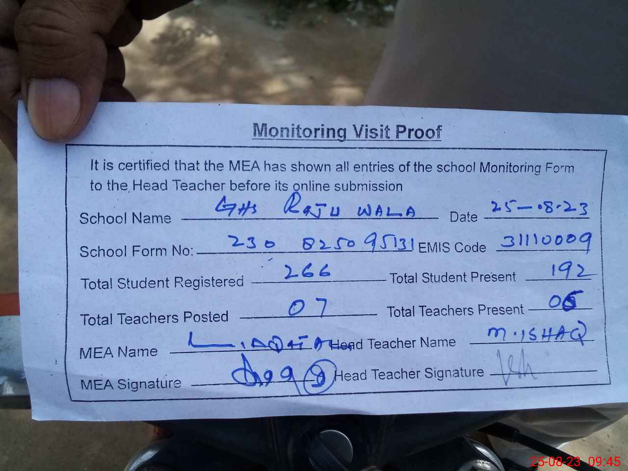 | Attendance Register | Head Teacher | MEA with School | Visit Proof |