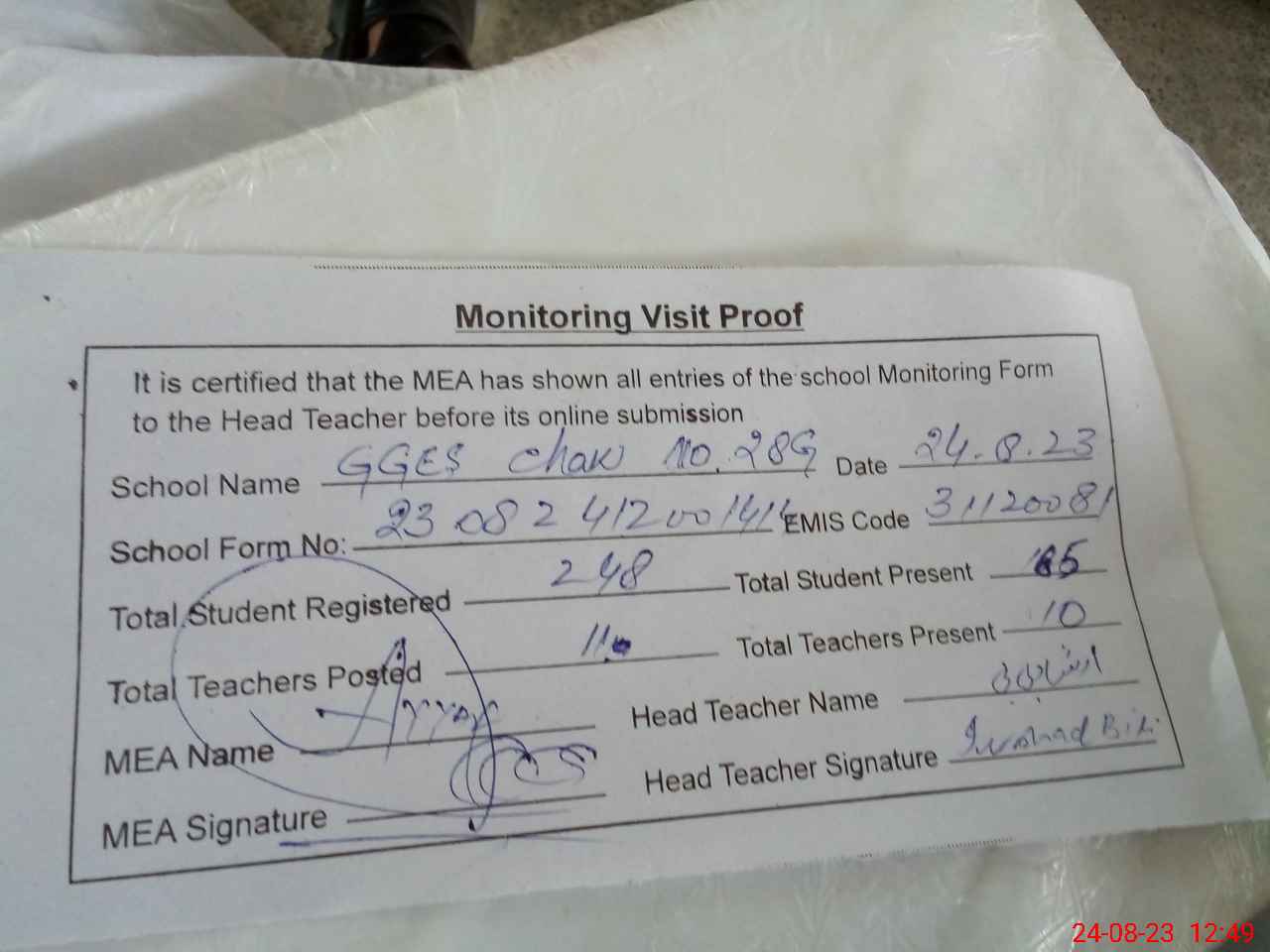 | Attendance Register | Head Teacher | MEA with School | Visit Proof |